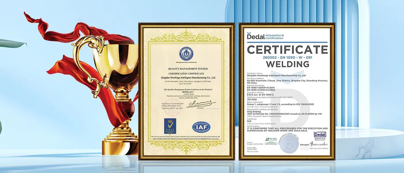 Qingdao Newforge Intelligent Manufacturing Co., Ltd. هي مؤسسة ذات تقنية عالية متخصصة في تصميم الهياكل الفولاذية والبحث والتطوير والتصنيع والتصدير. ومن خلال الاستفادة من المزايا اللوجستية لميناء تشينغداو ونقاط قوة المجموعة الصناعية، فإنه يوفر حلولاً مخصصة للبنية التحتية العالمية.